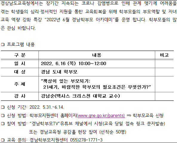 경상남도교육청 학부모 원격연수(사춘기 자녀 이해와 소통) 신청 안내